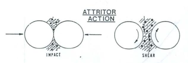 一般來說,攪拌臂的末端線速度是3-5 m/s,但“HSA”(新設計的高速攪拌磨)的運行速度要快4-5倍。攪拌磨中使用的介質尺寸為2毫米-10毫米。陶瓷工業(yè)中使用的介質類型包括氧化鋁、氧化鋯、硅酸鋯、滑石、氮化硅、碳化硅、碳化鎢、莫來石和玻璃。隨著速度(臂尖速度)和質量(磨介重量)的結合,研磨作用產生強大的沖擊力和剪切力(參見圖3)。這種結合的動量非常有效的減小了物料的尺寸。