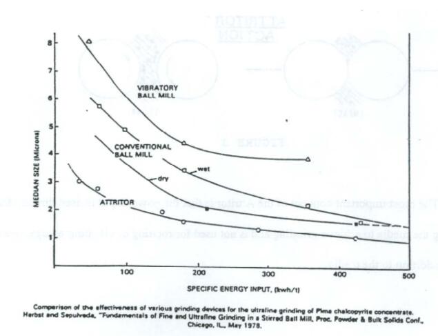 圖4顯示了各種研磨裝置對美國PIMA黃銅礦精礦進行超細研磨的效果比較。頂部曲線代表振動球磨機的數(shù)據;中間兩條曲線來自滾筒磨;底部曲線來自攪拌磨。如您所見,對于大約10千瓦時/噸的比能量輸入,通過使用攪拌磨獲得的D50比從滾筒磨獲得的小近50%,比從振動球磨機獲得的小約33%。