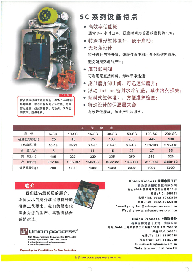 硬質(zhì)合金研磨專用立式攪拌磨SC系列 Union Process青島聯(lián)瑞精密機(jī)械有限公司(UP中國)